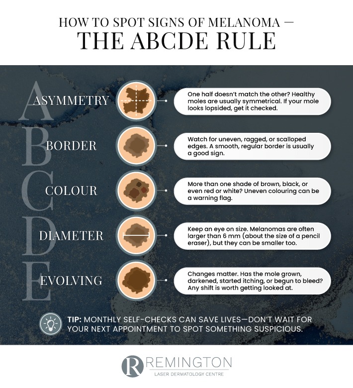 Melanomas usually appear as a new spot or an existing mole that starts to change. While they can vary in appearance, dermatologists use the ABCDE rule to help identify warning signs: